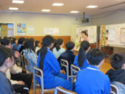 学校薬剤師の先生から、正しい生活習慣や、たばこやお酒、薬物の害について教えていただきました。子どもたちは、1本のジュースに入っている砂糖の量や、カップラーメンの塩分など、具体的な話を聞き、驚いていました。今回の学びを生かし、健康な体づくりをしてほしいです。