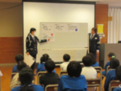 登下校の防犯についての知識を深めること、犯罪に巻き込まれないようにするための危機管理を学ぶことをねらいとして、一関警察署生活安全課の方を招いて、防犯教室を行いました。